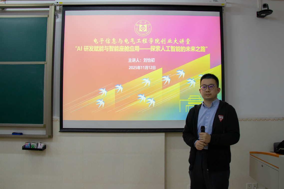 11月12日,电子信息与电气工程学院在科技楼B座308教室举办以“AI研发赋能与智能座舱应用”为主题的创业大讲堂专题讲座。本次活动特邀德赛西威智能交通研究院刘怡初博士担任主讲,仲恺信息学院黄剑锋副院长、徐琰宸老师及150多名学生参加讲座。